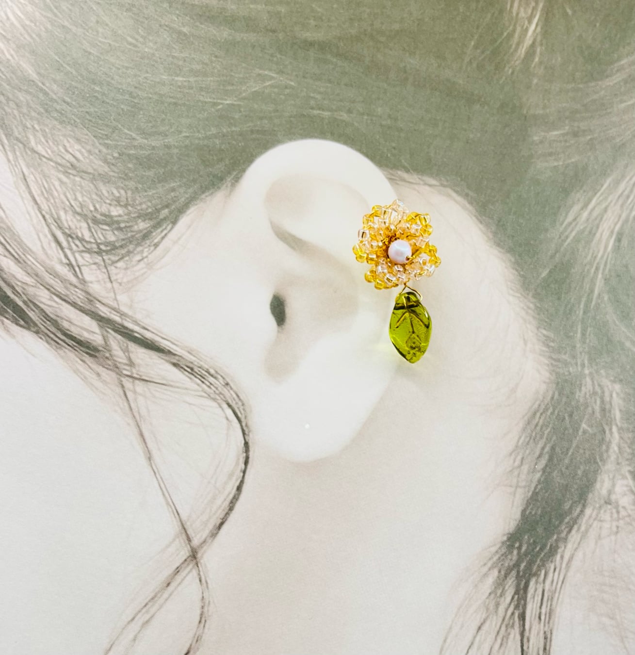 葉っぱ型のチェコビーズとビーズフラワー、ファイヤポリッシュの輝きが美しいソロバン型とドロップ型チェコビーズ、ゴールドパーツと極小4連パールの組み合わせの3点セットです。
