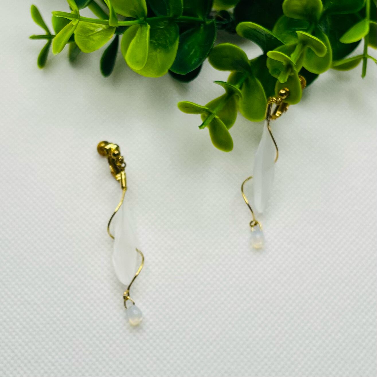説明:「上昇」や「飛躍」といった意味を持つ羽根とゴールドのらせんパーツ、ミルキーホワイトのチェコドロップビーズを組み合わせました。